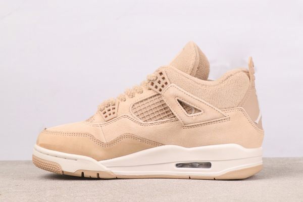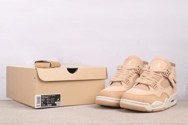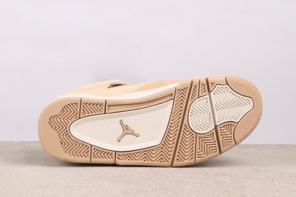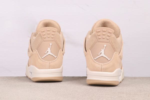 The Air Jordan 4 “Cozy Girl” is defined by its soft beige colorway. The upper is predominantly rendered in this gentle beige and has been given a unique suede treatment, resulting in a fine, plush surface that evokes the feeling of being swaddled in a warm, delicate blanket. This is not a static, single-note light brown; instead, it exhibits a subtle gradation from beige to light camel when viewed in different lights. This characteristic not only ensures a pleasingly soft feel but also uses variations in color depth to mark functional sections: the suede on the forefoot is tough and long-lasting, perfect for daily use. The side mesh paneling allows for breathability. The off-white midsole and outsole serve to lighten the visual profile, creating a soft interplay of light against the beige and apricot upper, making the overall design feel more elevated and airy. The laces, fashioned from the same family of suede material, merge inconspicuously with the shoe’s body.