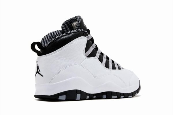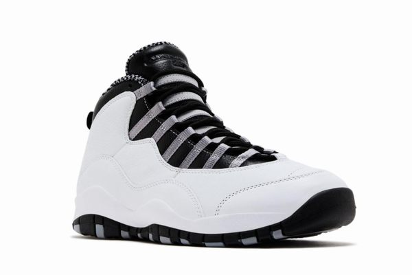 The Air Jordan 10 "Steel" 2025 adopts a simple yet powerful line design, with white as the main color tone, complemented by detailed decorations in silver and black, creating a cold yet refined aesthetic. The upper of the shoe is covered with a layer of smooth leather material, which has a fine touch and good wear resistance. The Jumpman logo on the side of the shoe is presented in silver, shining with a metallic luster, highlighting its high-end positioning.